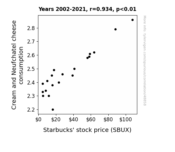 This means 87.3% of the change in the one variable (i.e., Starbucks' stock price (SBUX)) is predictable based on the change in the other (i.e., Cream and Neufchatel cheese consumption) over the 20 years from 2002 through 2021.