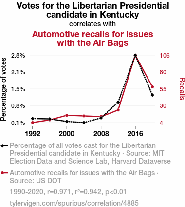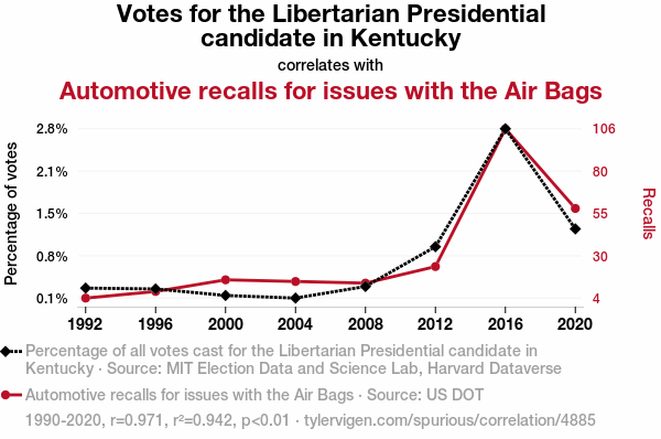 User prompt: Please provide potential search keywords for a paper titled Connecting Kentucky's Libertarian Leanings to Air Bag Anomalies: A Curious Correlation with an abstract of In this paper, we delve into the unexpected connection between votes for the Libertarian presidential candidate in Kentucky and automotive recalls for issues with the airbags. Our research team, armed with data from MIT Election Data and Science Lab, Harvard Dataverse, and US DOT, sought to untangle this curious correlation in an attempt to air out some unexpected connections. With a correlation coefficient of 0.9705796 and p < 0.01 for the years 1990 to 2020, our findings may blow your mind!