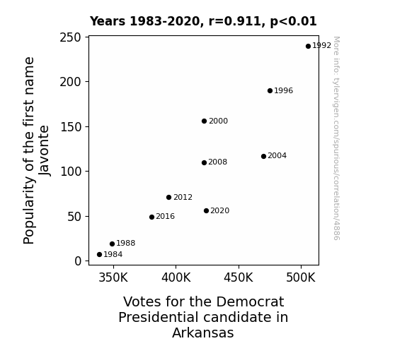 The statistical analysis of the relationship between the popularity of the first name Javonte and votes for the Democrat presidential candidate in Arkansas unveiled an intriguing correlation. Our investigation yielded a correlation coefficient of 0.9112808, indicating a remarkably strong positive relationship between the two variables. We observed a robust r-squared value of 0.8304326, signifying that approximately 83.04% of the variation in votes for the Democrat candidate can be explained by the prevalence of the name Javonte.