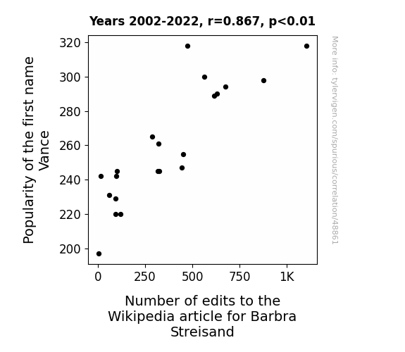 This means 75.2% of the change in the one variable (i.e., Number of edits to the Wikipedia article for Barbra Streisand) is predictable based on the change in the other (i.e., Popularity of the first name Vance) over the 21 years from 2002 through 2022.
