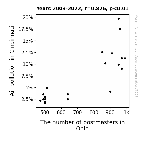 This means 68.3% of the change in the one variable (i.e., The number of postmasters in Ohio) is predictable based on the change in the other (i.e., Air pollution in Cincinnati) over the 20 years from 2003 through 2022.