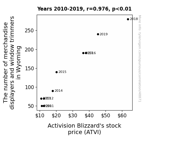 This means 95.3% of the change in the one variable (i.e., Activision Blizzard's stock price (ATVI)) is predictable based on the change in the other (i.e., The number of merchandise displayers and window trimmers in Wyoming) over the 10 years from 2010 through 2019.