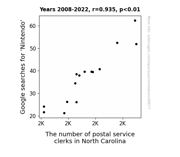 This means 87.5% of the change in the one variable (i.e., The number of postal service clerks in North Carolina) is predictable based on the change in the other (i.e., Google searches for 'Nintendo') over the 15 years from 2008 through 2022.