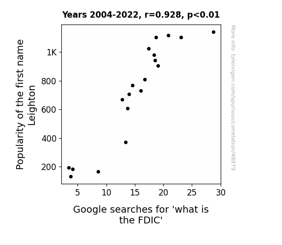 This means 86.1% of the change in the one variable (i.e., Google searches for 'what is the FDIC') is predictable based on the change in the other (i.e., Popularity of the first name Leighton) over the 19 years from 2004 through 2022.