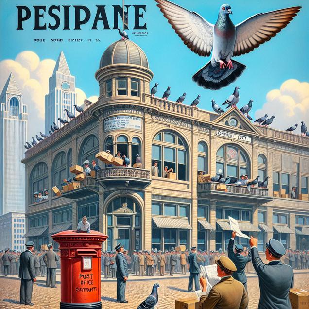 User prompt: Please respond with an image generation prompt that would be likely to create an interesting visual using DALLE-3, using the following style: [ A TIME magazine cover image ] and depicting this scene: In a park in Cincinnati, the sky is clear as the air quality improves. A group of carrier pigeons is perched on a post office building, looking healthy and active. Inside the building, some pigeons are sorting mail and delivering packages with great efficiency. The human postmasters are seen leaving their posts, waving goodbye as they realize the pigeons have taken over their roles. The number of postmasters in Ohio decreases as the pigeons confidently handle all the important tasks. Keep the visual depiction simple. Do not include any words or speech bubbles.