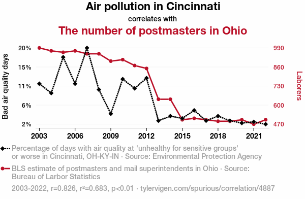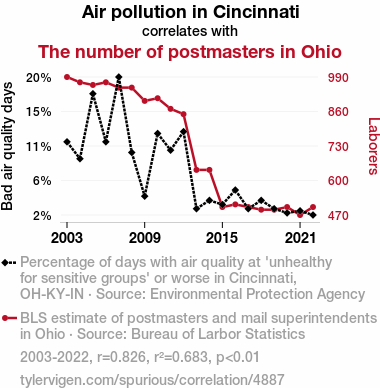 A linear line chart with years as the X-axis and two variables on the Y-axis. The first variable is Air pollution in Cincinnati and the second variable is The number of postmasters in Ohio.  The chart goes from 2003 to 2022, and the two variables track closely in value over that time. Small Image