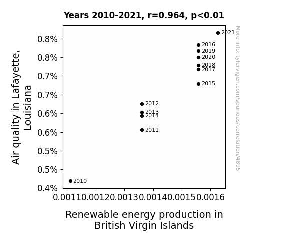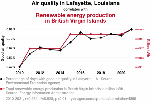 This means 92.8% of the change in the one variable (i.e., Renewable energy production in British Virgin Islands) is predictable based on the change in the other (i.e., Air quality in Lafayette, Louisiana) over the 12 years from 2010 through 2021.