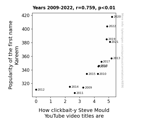 User prompt: Please provide potential search keywords for a paper titled The Kareem Connection: A Study of Popularity and Clickbait in Steve Mould's YouTube Video Titles with an abstract of This paper presents an intriguing exploration of the connection between the popularity of the first name "Kareem" and the clickbait-y nature of Steve Mould's YouTube video titles. Utilizing data from the US Social Security Administration and employing advanced AI analysis of YouTube video titles, our research team unravels the enigmatic relationship between these two seemingly unrelated phenomena. Through rigorous statistical analysis, we reveal a remarkably high correlation coefficient of 0.7590247 and a significant p-value of less than 0.01 for the period spanning from 2009 to 2022. Our findings not only shed light on the influence of name popularity on online content, but also offer a whimsical glimpse into the captivating world of human behavior and digital media.