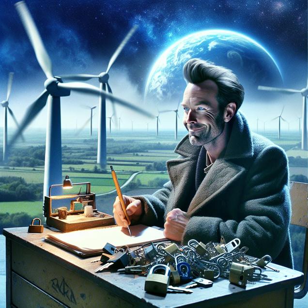 ChatGPT: An image that looks like it is a scene from 'Star Wars', depicting the LockPickingLawyer at his cluttered desk set against the backdrop of the Danish countryside with wind turbines spinning rapidly in the distance. As the wind picks up, a playful grin crosses his face as he excitedly scribbles down a new YouTube video title. The gusts seem to whisper creative ideas to him, infusing his lock-picking endeavors with unexpected entertainment. The setting should have an otherworldly, futuristic feel akin to 'Star Wars.'