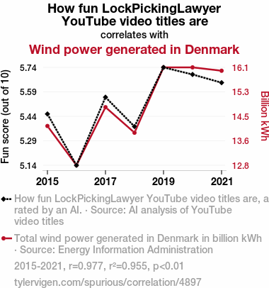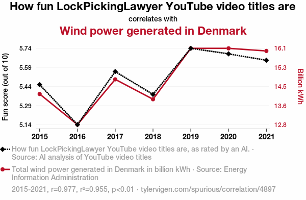 - The spurious research paper: Unlocking Renewable Riddles: The Surprising Correlation Between LockPickingLawyer YouTube Titles and Wind Power in Denmark