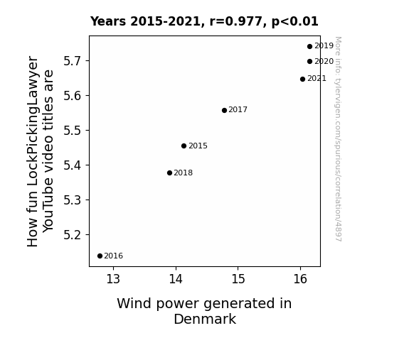 This means 95.5% of the change in the one variable (i.e., Wind power generated in Denmark) is predictable based on the change in the other (i.e., How fun LockPickingLawyer YouTube video titles are) over the 7 years from 2015 through 2021.