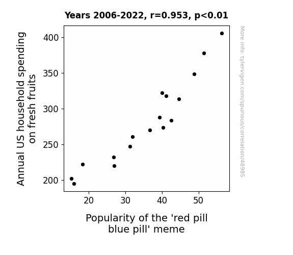 This means 90.7% of the change in the one variable (i.e., Popularity of the 'red pill blue pill' meme) is predictable based on the change in the other (i.e., Annual US household spending on fresh fruits) over the 17 years from 2006 through 2022.