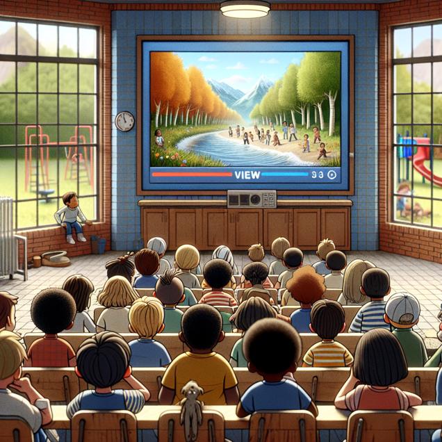 Prompt: Certainly! Here's an image generation prompt using the style "[An image that looks like it is a scene from a Pixar movie]": "Create an image that resembles a scene from a Pixar movie. In this scene, children are sitting in front of a large screen, watching MinuteEarth's videos with rapt attention. The view counter on the videos is rapidly increasing. Meanwhile, outside, the playground and parks are empty as children are engrossed in the educational content, effectively reducing their exposure to asthma triggers. Ensure the visual depiction is simple and does not include any words or speech bubbles." The depiction should include only scenes, people, and objects, it should not include text or speech bubbles.