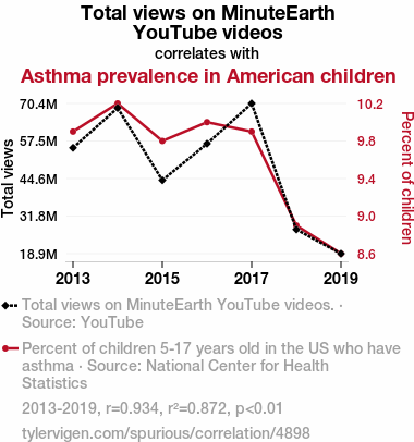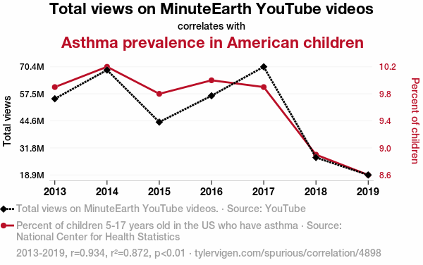 This means 87.2% of the change in the one variable (i.e., Asthma prevalence in American children) is predictable based on the change in the other (i.e., Total views on MinuteEarth YouTube videos) over the 7 years from 2013 through 2019.