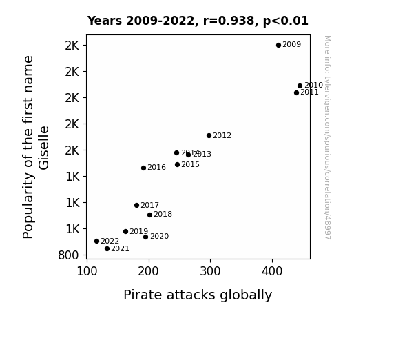 This means 88% of the change in the one variable (i.e., Pirate attacks globally) is predictable based on the change in the other (i.e., Popularity of the first name Giselle) over the 14 years from 2009 through 2022.
