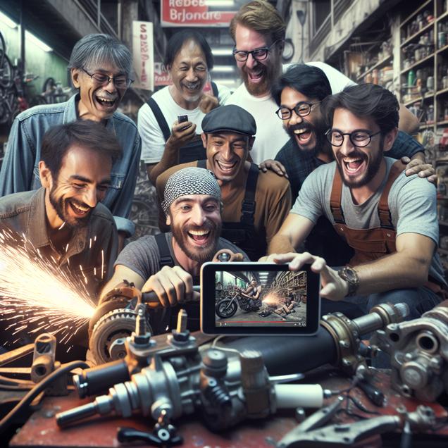 ChatGPT: Create an image of a lively motorcycle workshop in Washington. The scene showcases a group of mechanics huddled around a cluttered workbench, engrossed in watching Simone Giertz's latest YouTube video on a small, portable screen. The mechanics are caught in the moment, laughing and exchanging animated discussions about Simone's quirky DIY projects. As they fine-tune the motorcycle, their enthusiasm is reflected in the sparks flying from the spark plugs, mirroring the excitement generated by Simone's electrifying content.