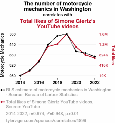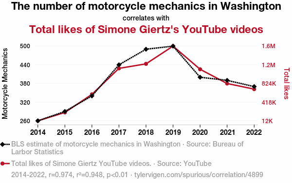 Simone Giertz, motorcycle mechanics, Washington, YouTube videos, Bureau of Labor Statistics, correlation coefficient, YouTube analytics, statistical correlation, unexpected relationship, connection between motorcycle mechanics and Simone Giertz videos