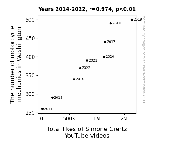 This means 94.8% of the change in the one variable (i.e., Total likes of Simone Giertz's YouTube videos) is predictable based on the change in the other (i.e., The number of motorcycle mechanics in Washington) over the 9 years from 2014 through 2022.