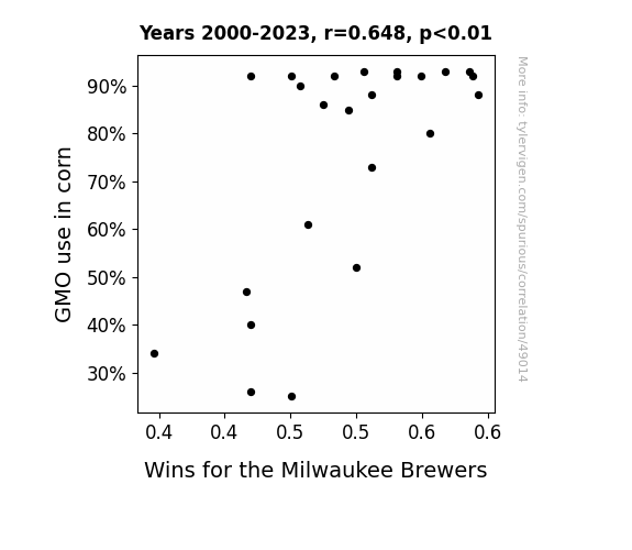 This means 42% of the change in the one variable (i.e., Wins for the Milwaukee Brewers) is predictable based on the change in the other (i.e., GMO use in corn) over the 24 years from 2000 through 2023.