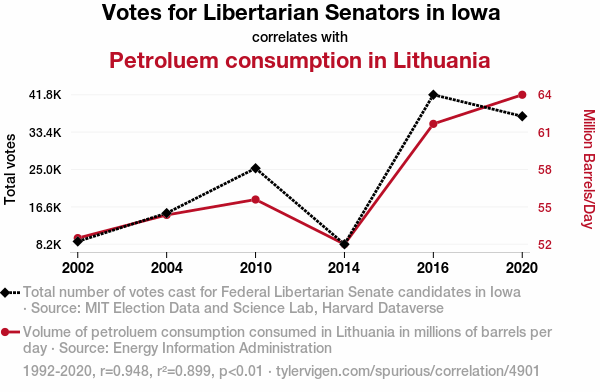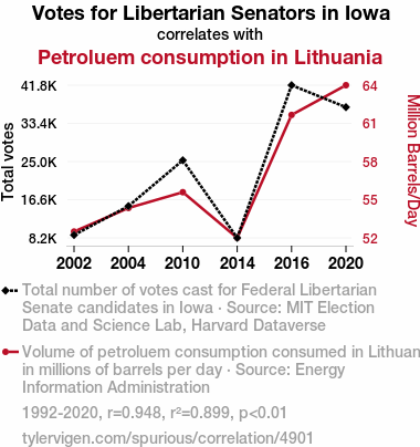 libertarian vote, Iowa, petroleum consumption, Lithuania, correlation, MIT Election Data and Science Lab, Harvard Dataverse, Energy Information Administration, correlation coefficient, statistical analysis, causation, global phenomena
