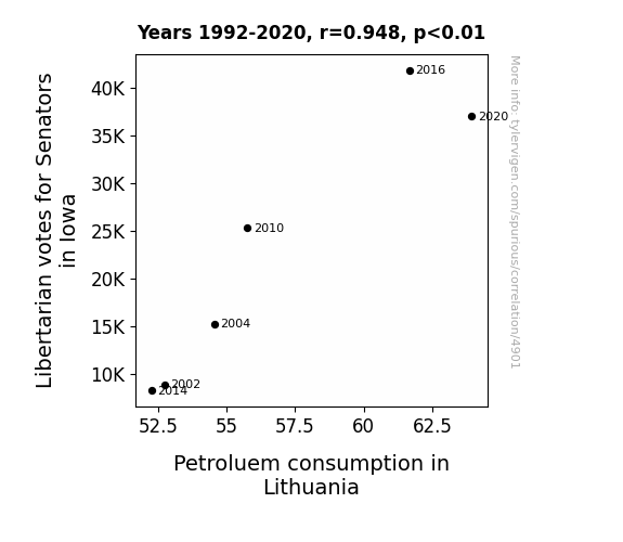 This means 89.9% of the change in the one variable (i.e., Petroluem consumption in Lithuania) is predictable based on the change in the other (i.e., Votes for Libertarian Senators in Iowa) over the 6 years from 1992 through 2020.