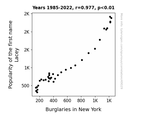 This means 95.5% of the change in the one variable (i.e., Burglaries in New York) is predictable based on the change in the other (i.e., Popularity of the first name Lacey) over the 38 years from 1985 through 2022.