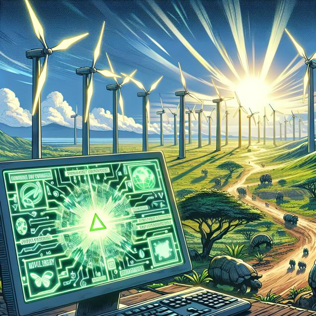Prompt: Generate an image that combines a vibrant Tanzanian landscape with massive green energy turbines humming rhythmically. In the foreground, a sleek computer screen pulses with the glow of innovation, churning out trendy, eye-catching YouTube video titles. Each title is adorned with emojis, trendy slang, and references to popular games, showcasing the newfound trendy consciousness infused by the surge of biomass power. Through this, the Game Theorists' video titles now captivate the attention of eco-conscious gamers worldwide, all enhanced by the powerful energy of the Tanzanian biomass. This illustration should capture the sense of power and possibility in the air while channeling the trendy consciousness infused by the surge of biomass power. The depiction should include only scenes, people, and objects, it should not include text or speech bubbles.