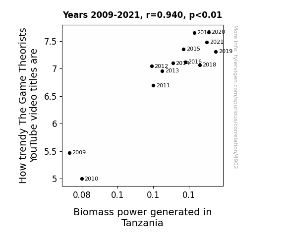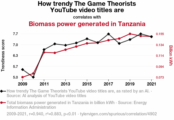 This means 88.3% of the change in the one variable (i.e., Biomass power generated in Tanzania) is predictable based on the change in the other (i.e., How trendy The Game Theorists YouTube video titles are) over the 13 years from 2009 through 2021.