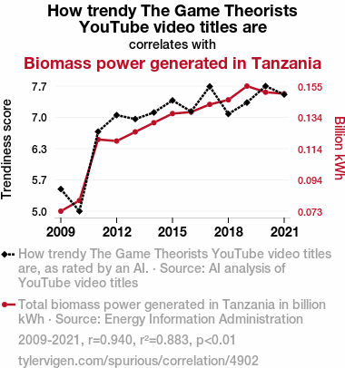 User prompt: Please make up a funny explanation for how an increase in How trendy The Game Theorists YouTube video titles are caused Biomass power generated in Tanzania to increase.