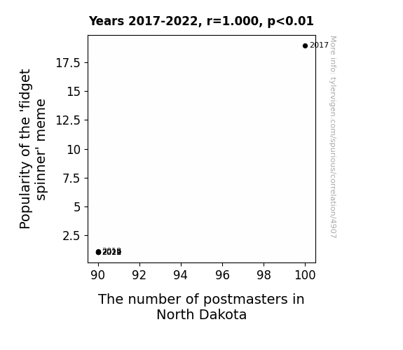 This means 100% of the change in the one variable (i.e., The number of postmasters in North Dakota) is predictable based on the change in the other (i.e., Popularity of the 'fidget spinner' meme) over the 6 years from 2017 through 2022.