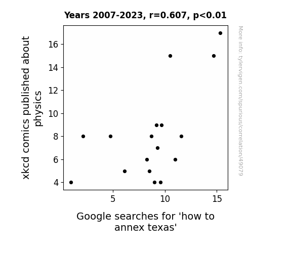 This means 36.9% of the change in the one variable (i.e., Google searches for 'how to annex texas') is predictable based on the change in the other (i.e., xkcd comics published about physics) over the 17 years from 2007 through 2023.