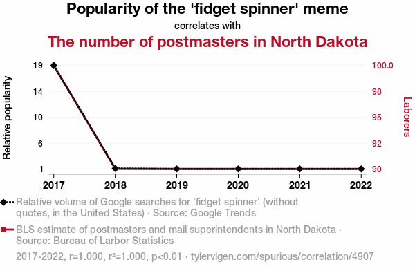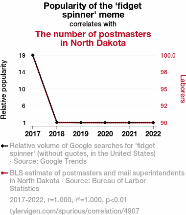 - The spurious research paper: Spinning into the Postal System: A Correlation Study of Fidget Spinner Meme Popularity and Postmaster Numbers in North Dakota