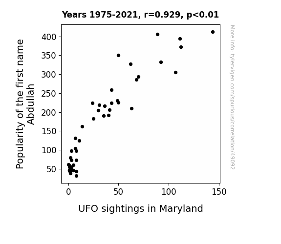This means 86.2% of the change in the one variable (i.e., UFO sightings in Maryland) is predictable based on the change in the other (i.e., Popularity of the first name Abdullah) over the 47 years from 1975 through 2021.