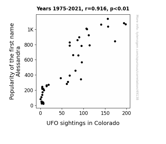 This means 84% of the change in the one variable (i.e., UFO sightings in Colorado) is predictable based on the change in the other (i.e., Popularity of the first name Alessandra) over the 47 years from 1975 through 2021.