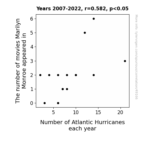 This means 33.9% of the change in the one variable (i.e., Number of Atlantic Hurricanes each year) is predictable based on the change in the other (i.e., The number of movies Marilyn Monroe appeared in) over the 16 years from 2007 through 2022.