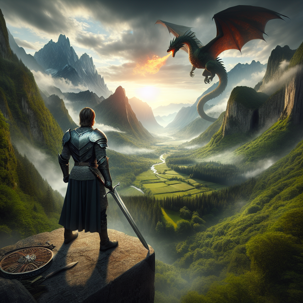 Prompt: [ A scene from Skyrim ] An armor-clad warrior stands at the edge of a rugged cliff, gazing out across a breathtaking valley. Towering mountains loom in the distance, their peaks shrouded in mist. The warrior's stony expression reflects a sense of determination as they prepare to embark on an epic quest. In the sky above, a majestic dragon soars with its wings outstretched, its fiery breath casting an otherworldly glow upon the landscape below. As the dragon vanishes into the horizon, the sunlight illuminates an ancient sword embedded in a stone, casting mystical shadows upon the warrior's steely visage. The depiction should include only scenes, people, and objects, it should not include text or speech bubbles.