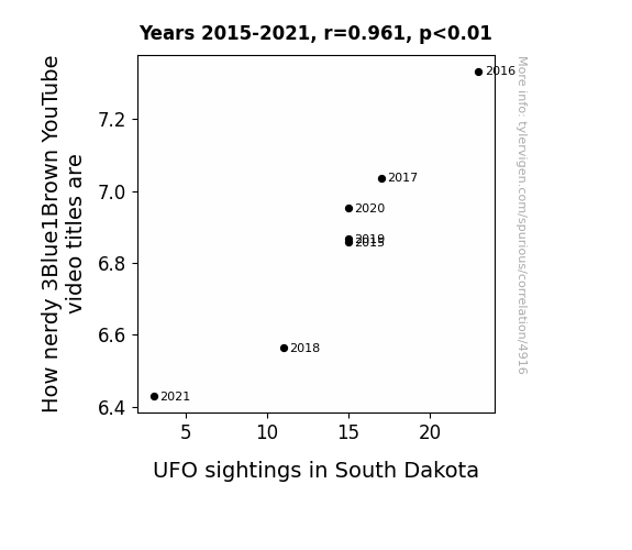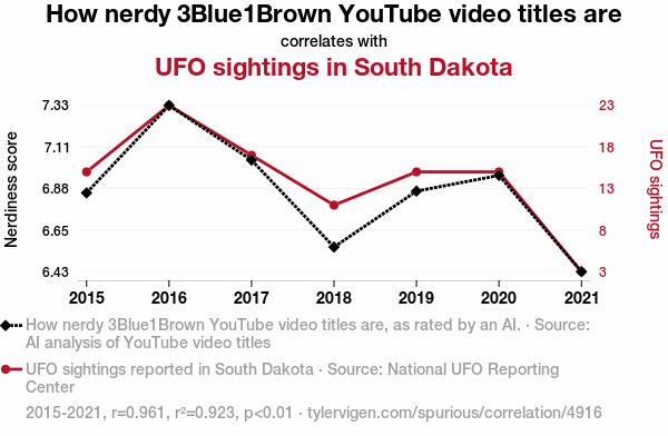 This means 92.3% of the change in the one variable (i.e., UFO sightings in South Dakota) is predictable based on the change in the other (i.e., How nerdy 3Blue1Brown YouTube video titles are) over the 7 years from 2015 through 2021.