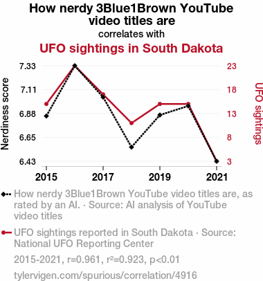 3Blue1Brown, UFO sightings, South Dakota, YouTube video titles, nerdiness, correlation, data analysis, statistical significance, AI analysis, National UFO Reporting Center, human perception, whimsical intricacies, cosmic correlation