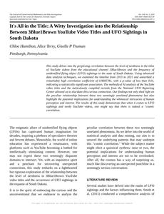 User prompt: Please provide potential search keywords for a paper titled It's All in the Title: A Witty Investigation into the Relationship Between 3Blue1Brown YouTube Video Titles and UFO Sightings in South Dakota with an abstract of This study delves into the perplexing correlation between the level of nerdiness in the titles of YouTube videos from the educational channel 3Blue1Brown and the frequency of unidentified flying object (UFO) sightings in the state of South Dakota. Using advanced data analysis techniques, we examined the timeline from 2015 to 2021 and unearthed a remarkably high correlation coefficient of 0.9605781, with a p-value of less than 0.01, indicating a statistically significant association. The methodical AI analysis of the YouTube video titles and the meticulously compiled records from the National UFO Reporting Center allowed us to elucidate this curious connection. Our findings not only shed light on the peculiar relationship between these two seemingly unrelated phenomena but also highlight the potential implications for understanding the whimsical intricacies of human perception and interest. The results of this study demonstrate that when it comes to UFO sightings and nerdy YouTube videos, one might say that there is indeed a "cosmic correlation.