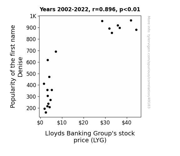 This means 80.3% of the change in the one variable (i.e., Lloyds Banking Group's stock price (LYG)) is predictable based on the change in the other (i.e., Popularity of the first name Denise) over the 21 years from 2002 through 2022.