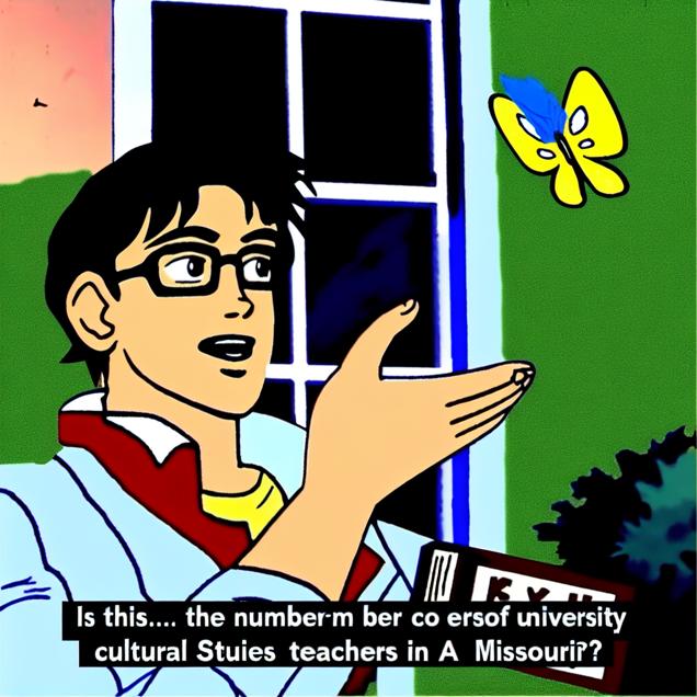 Create a meme inspired by the is this a butterfly meme that in some way references The number of university cultural studies teachers in Missouri. Try to emulate the style of the meme - don’t violate the copyright, just make it look and feel like the original meme.