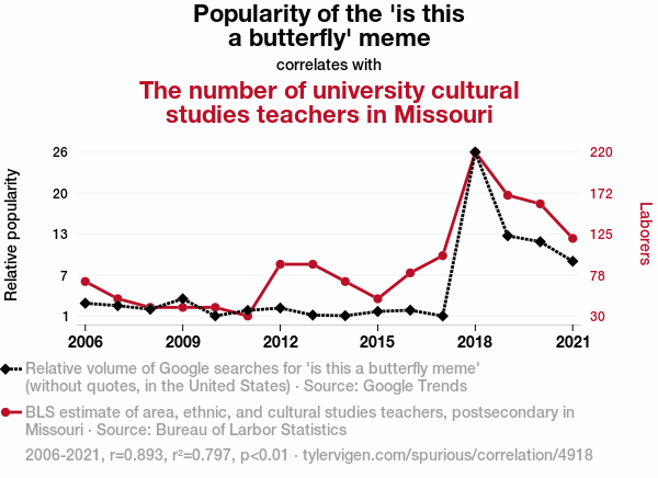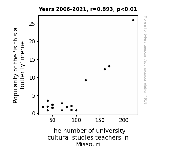 - The spurious research paper: Butterfly Effect: Exploring the Correlation Between the 'is this a butterfly' Meme Popularity and the Number of University Cultural Studies Teachers in Missouri