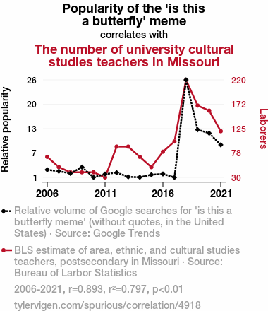 User prompt: Please provide potential search keywords for a paper titled Butterfly Effect: Exploring the Correlation Between the 'is this a butterfly' Meme Popularity and the Number of University Cultural Studies Teachers in Missouri with an abstract of The "is this a butterfly" meme has fluttered its way into the hearts and screens of internet users, captivating audiences with its playful yet thought-provoking nature. This study delves into the whimsical world of internet phenomena and academia, seeking to understand the intriguing relationship between the popularity of the "is this a butterfly" meme and the number of university cultural studies teachers in the state of Missouri. Through meticulous data analysis, encompassing Google Trends and Bureau of Labor Statistics, we unveiled a correlation coefficient of 0.8927935 and p < 0.01, spanning the years 2006 to 2021.