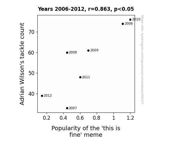 This means 74.5% of the change in the one variable (i.e., Popularity of the 'this is fine' meme) is predictable based on the change in the other (i.e., Adrian Wilson's tackle count) over the 7 years from 2006 through 2012.