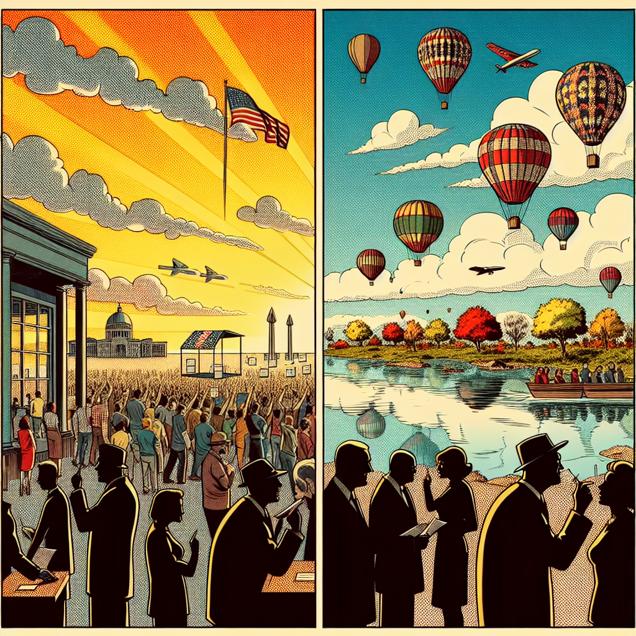 ChatGPT: Generate a comic-book-style illustration with muted colors reminiscent of the 1960s, featuring a scene of increased voter turnout for Democrat Senators in Alabama. In the foreground, capture the excitement of people casting their votes, with vibrant energy and a sense of unity. As the scene transitions to the background, depict the hot air soaring across the sea to Kyrgyzstan, where a colorful festival is in full swing. Show hot air balloons filling the sky, creating a visually striking contrast between the scenes. Utilize a dotted halftone pattern to enhance the vintage comic aesthetic.