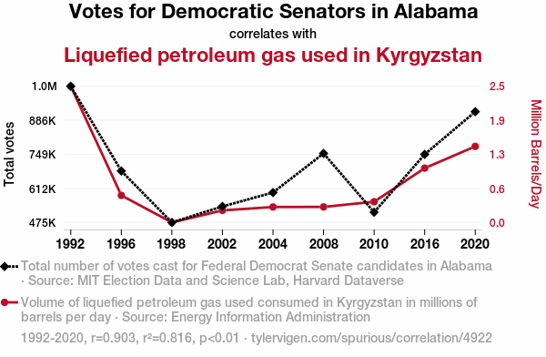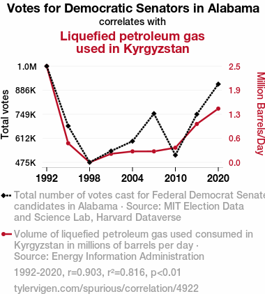 - The spurious research paper: Democratic Gas: Unearthing the Curious Correlation between Alabama Senatorial Votes and LPG Consumption in Kyrgyzstan