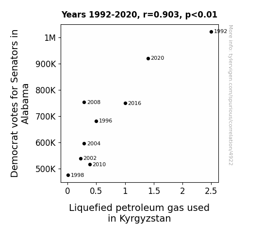 This means 81.6% of the change in the one variable (i.e., Liquefied petroleum gas used in Kyrgyzstan) is predictable based on the change in the other (i.e., Votes for Democratic Senators in Alabama) over the 9 years from 1992 through 2020.