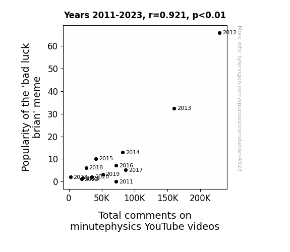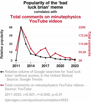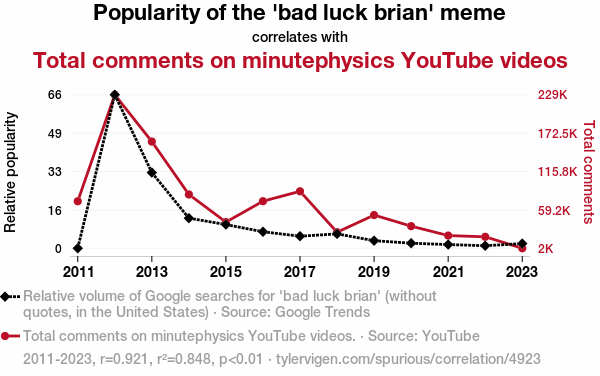 - The spurious research paper: Unlucky Linkage: Exploring the Correlation between 'Bad Luck Brian' Meme Popularity and Total Comments on MinutePhysics YouTube Videos