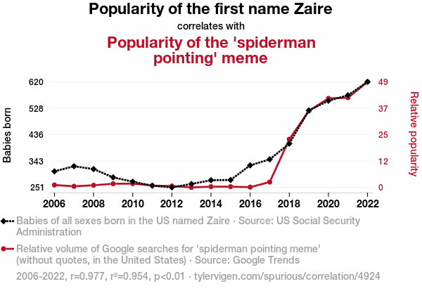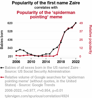 This means 95.4% of the change in the one variable (i.e., Popularity of the 'spiderman pointing' meme) is predictable based on the change in the other (i.e., Popularity of the first name Zaire) over the 17 years from 2006 through 2022.