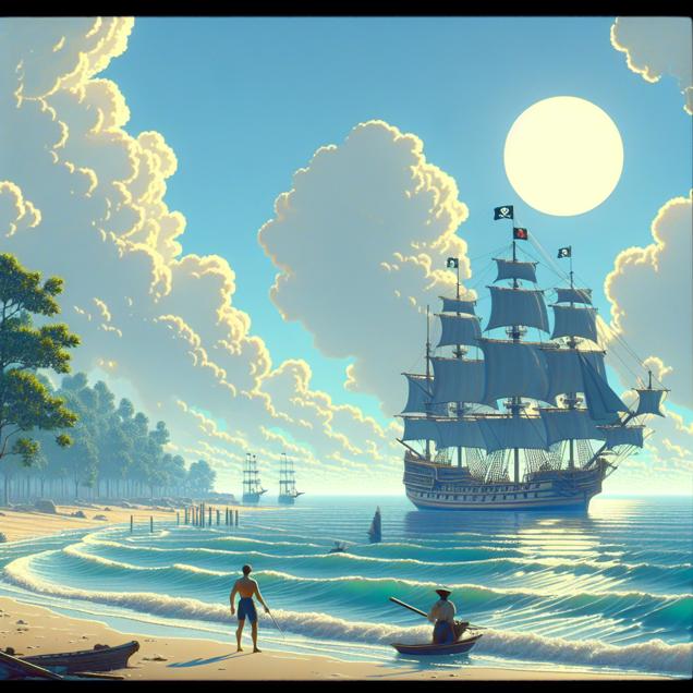 Prompt: Generate a 3D Pixar-style image of a coastal scene in Shreveport, Louisiana, with a clear sky and improved air quality. Show a pirate ship on the horizon, its crew lowering the Jolly Roger flag to half-mast in reaction to the improved visibility. The scene should have a sense of the smog lifting and the surprise advantage being lost for the pirates, with an overall serene and slightly humorous tone. The depiction should include only scenes, people, and objects, it should not include text or speech bubbles.